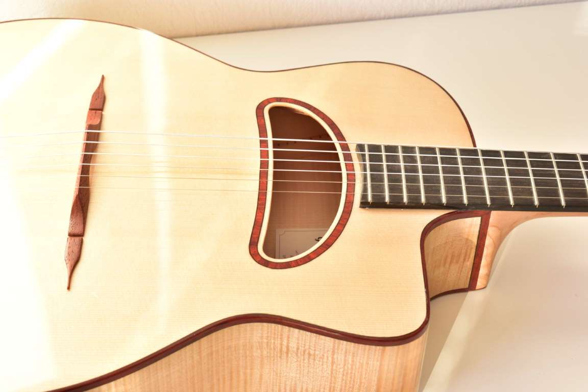 It has the same shape as a traditional gypsy guitar but with a wider sound hole at a higher location. This results in a larger active part of the top, around the bridge. A thin top with two light braces that carry the bridge and a thin light bridge of rosewood produce a unique, loud and all round guitar sound.